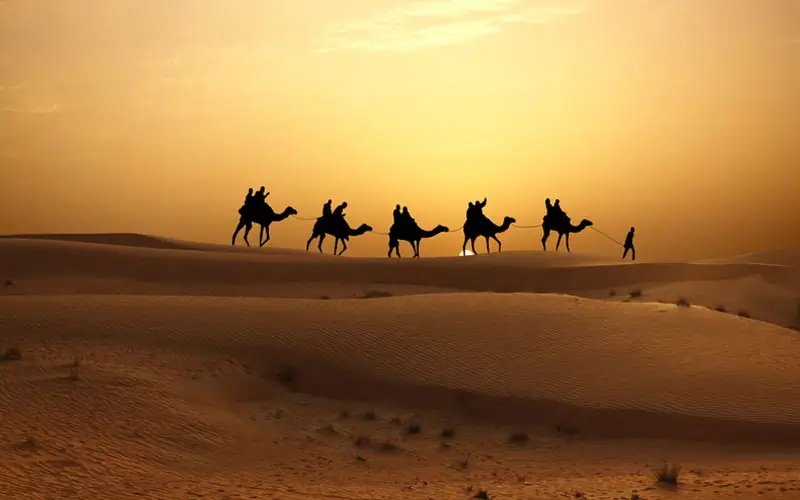 Sunset turns everything to molten amber. Photographers love framing silhouettes of camel caravans against burning skies. Try shooting at low angles for patterns and reflections on wind-shaped dunes.