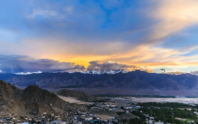 Sunset at Shanti Stupa in Leh or Thiksey Monastery delivers panoramic drama — golden peaks against indigo skies. Photographers should carry ND filters to balance brightness at high altitudes.