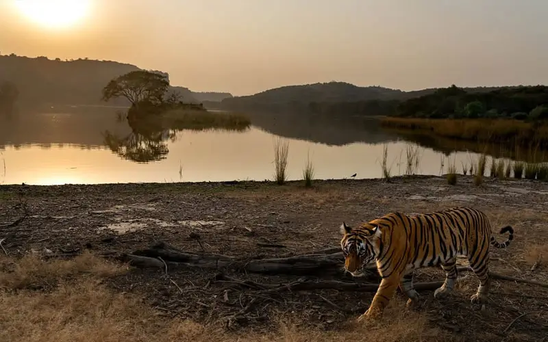 Late afternoon safaris bring sunset drama — orange dust trails, silhouetted trees, and tigers bathing in warm light. Using telephoto lenses at these hours yields vivid contrasts.