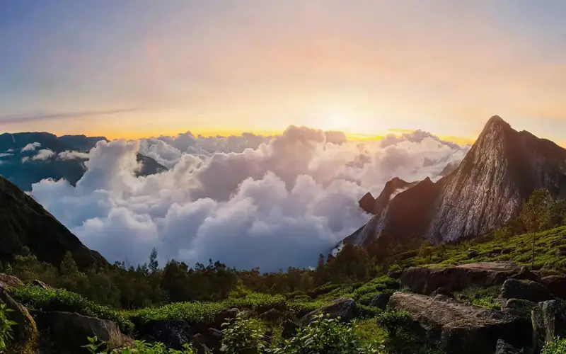 In Kerala’s hill country, sunrise unveils tea estates blanketed in mist. From viewpoints like Top Station and Kolukkumalai, rows of green hills roll endlessly, each catching a different shade of dawn.